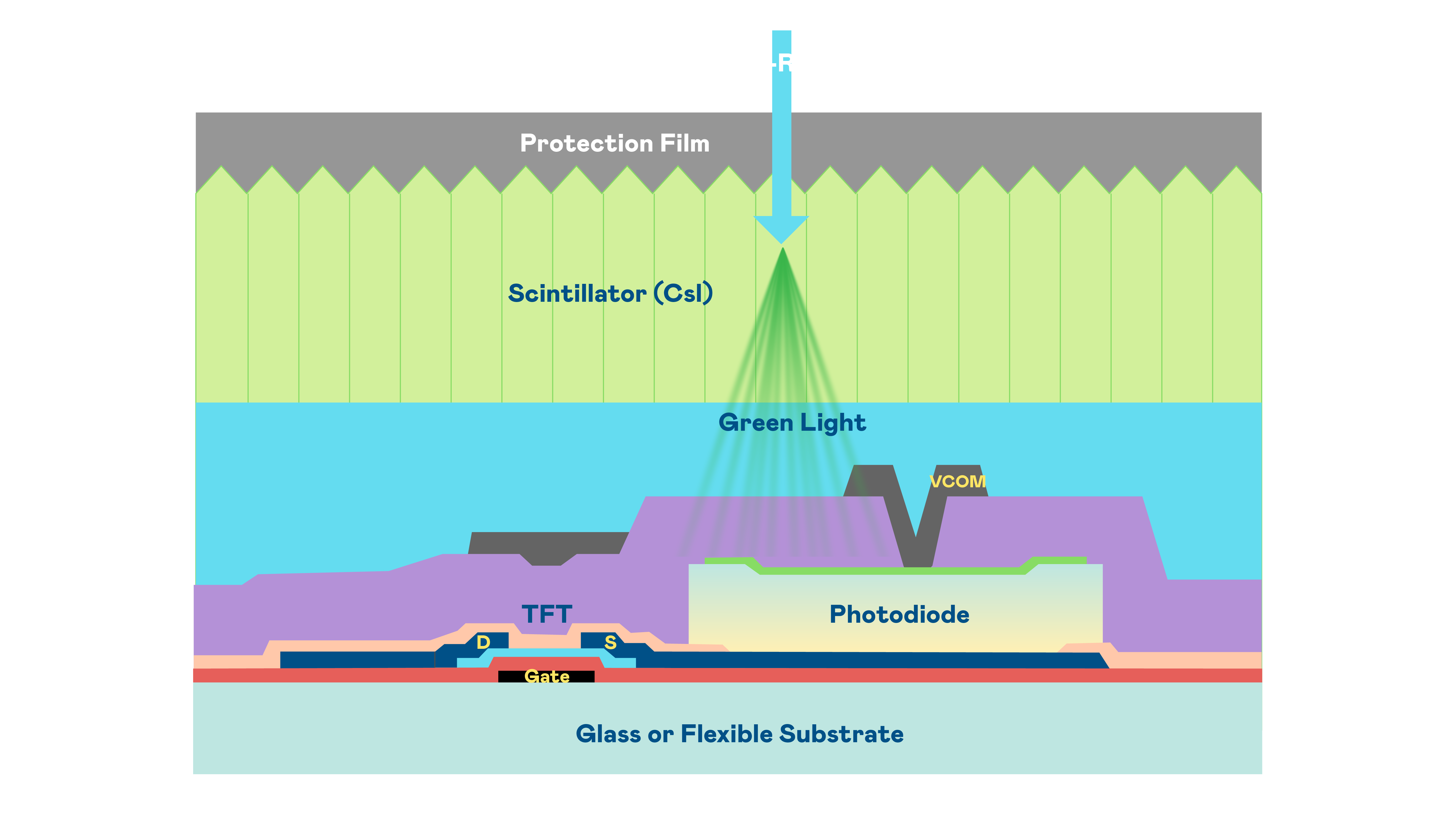 巅峰国际的X光影像感测阵列使用薄膜电晶体 (TFT) 作为每个像素的读取开关,搭配光电二极体(Photodiode)的光电转换元件,用以感测X光影像讯号。